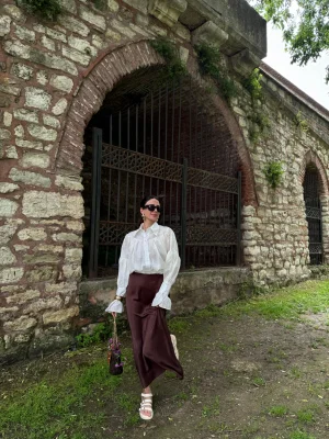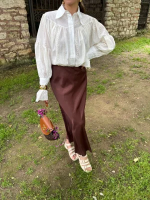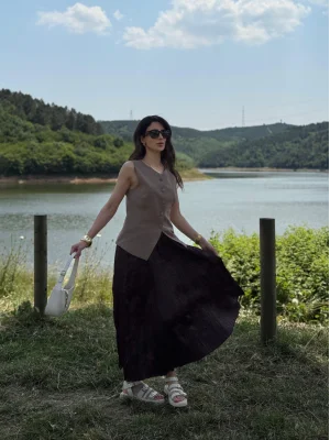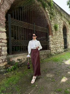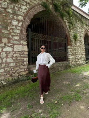 Saten Buruşuk Görünümlü Etek Kahverengi