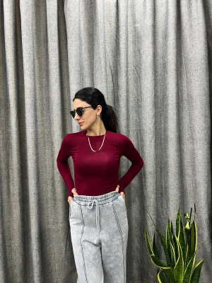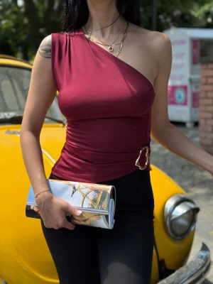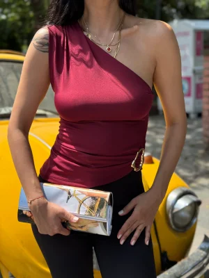Bordo Asimetrik Yaka Tek Omuz Beli Metal Aksesuarlı Drapeli Bluz